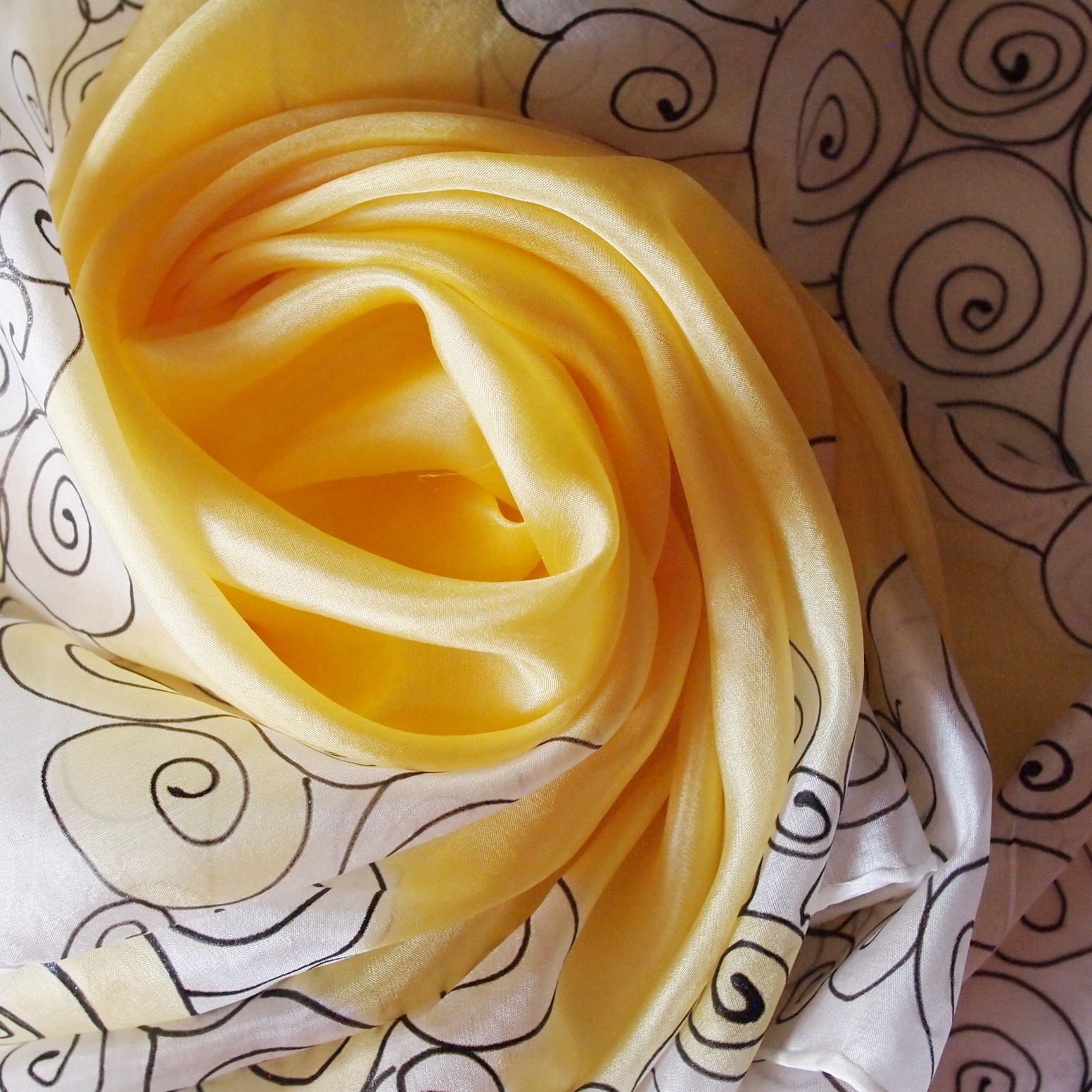 Jednoduchý elegantní šátek 74 x 74 cm. Lem šátku je zdoben černými ornamenty. Barva šátku - světle žlutá, jasná, jemná a elegantní.