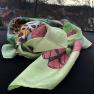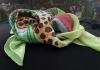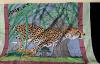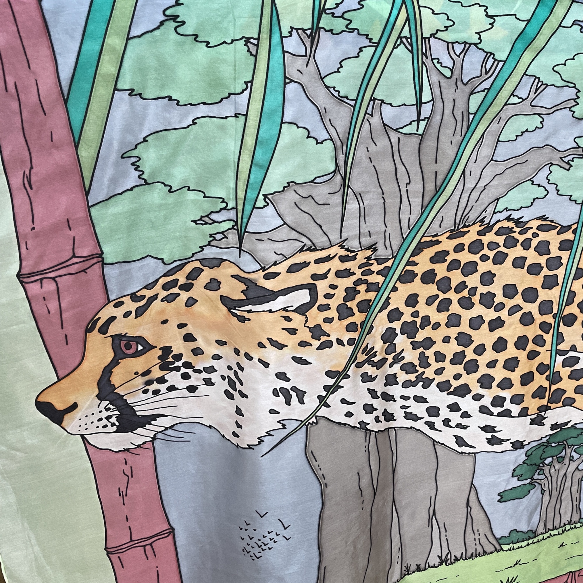Na velkém hedvábném šátku je gepard v savaně, kolem stromy, tráva, dokonce hory. Vše malováno v jemných barvách.