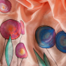 Šátek je jemný, lesklý, hebký, malovaný napřovacími barvami, které pronikají hluboko do vlákna a hedvábí si ponechá své krásné vlastnosti.