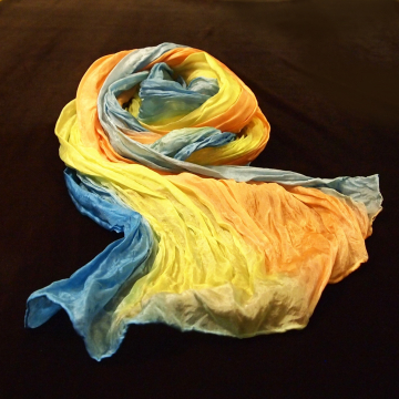 Malovaná hedvábná šála 140 x 45 cm ve čtyřech pastelových odstínech. Jemná a s efektem vrapování - tj. mačkaný vzhled (šála se nechá usušit smotaná). Lze ji za vlhka vyžehlit do hladka - chcete-li.