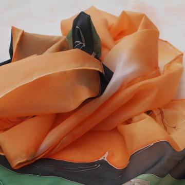 Hedvábná šála, ručně malovaná, s motivem Ještědského pohoří. Oranžová.