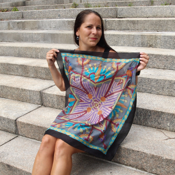 Ručně malovaný hedvábný šátek, 74 x 74 cm, hedvábí je jemné a lesklé.