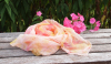 Lehce zdobeno konturou. Šátek je ponechán ve vrapované úpravě (mačkané - sušené volně položené stočené do uzlu), je možné vyžehlit do hladka.