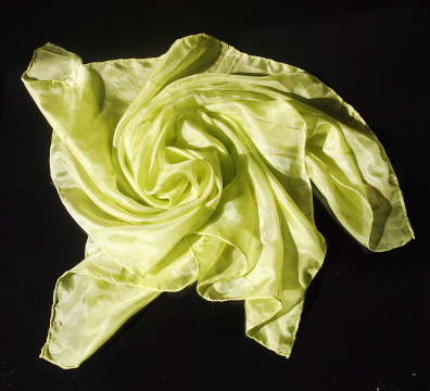 Malováno zelenozlatou napařovací barvou, hedvábí zůstává lehké, jemné, krásně splývá. Lze prát i žehlit - perte krátce a lehce jen ve vlažné vodě ručně, žehlete raději po rubové straně.