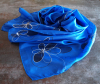 Hedvábná šála v modré barvě (technicky barvená) je zdobená malbou květin, s použitím bílé a černé kontury,